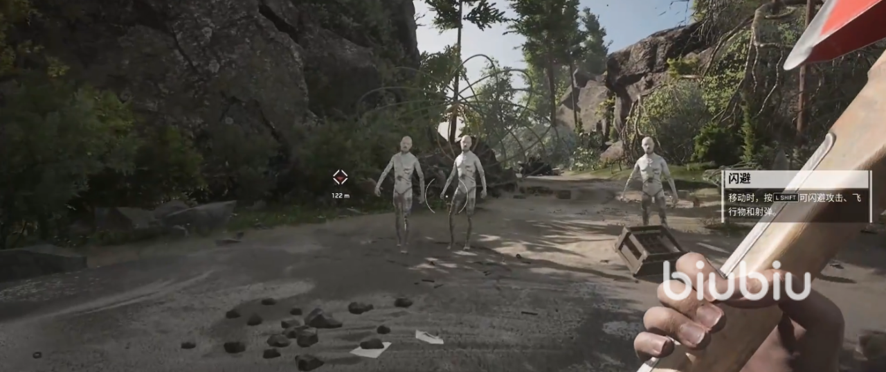 穿过聚合体后便会在游戏内遇到三个VOV-A6实验助手,这也是游戏内的第一场遭遇战,需要注意的是与之战斗需要保持一定的距离,并且不能站在原地不动,可以按住方向键加shift进行滑步闪避,但由于敌人被设定为教学内容,所以完全不用担心难度,耐心的跟随系统的引导便可以击败他们,击败后可以对着尸体按住F进行材料的回收,材料可以帮助玩家升级武器或者制造新的武器,大家不要小看这点材料,升级制造所消耗的数量非常的大,所以一定要在游戏的前期养成习惯,做好材料的积累。