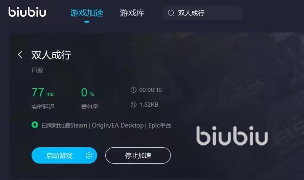 不过有不少玩家都反映有延迟高、卡顿的情况,使得两人之间配合不利,非常影响游戏体验感。对于此问题的解决办法很简单,只需下载一款加速器软件就行啦,小编推荐各位试试biubiu,能对网络环境进行优化,使之稳定通畅。小编接下来说一下具体的使用方法,小伙伴们在电脑端下载好biubiu加速器后注册登录,搜索“双人成行”后点击蓝色按钮就行,用户能清楚看到软件实时的优化情况。在biubiu软件内可直接启动游戏,结束娱乐时点击停止加速,即刻停止优化,并显示出加速时常、效果等,是不是很便捷呢?