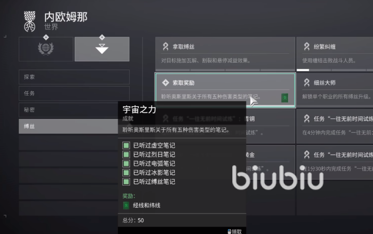 这五种伤害分别是虚空、烈日、电弧、冰影、缚丝,这五种伤害也就合成为了宇宙之力,让我们变得强大,成就的奖励是经线和纬线,成就分是50分,小编前面只和大家介绍了一下缚丝,不是说只有缚丝最重要,其他的四种伤害类型也是非常重要的,它们本身就是相辅相成的,之所以着重的说明缚丝也是希望大家去善加利用这个全新的玩法,早日的通关游戏,获得最终的乐趣。