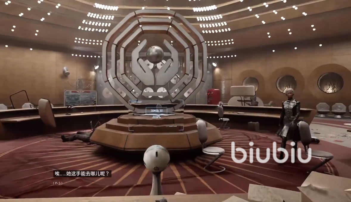 主角会向她询问下一道门怎么开,通过对话可以知道,这个机器人被拆散了,并且丢失了手臂。玩家欣然接下来这个任务并且开始了寻找,整个地图路线不是那么复杂,顺着过道一直走会看见一个圆盘锁,但是需要密码,这可怎么办。