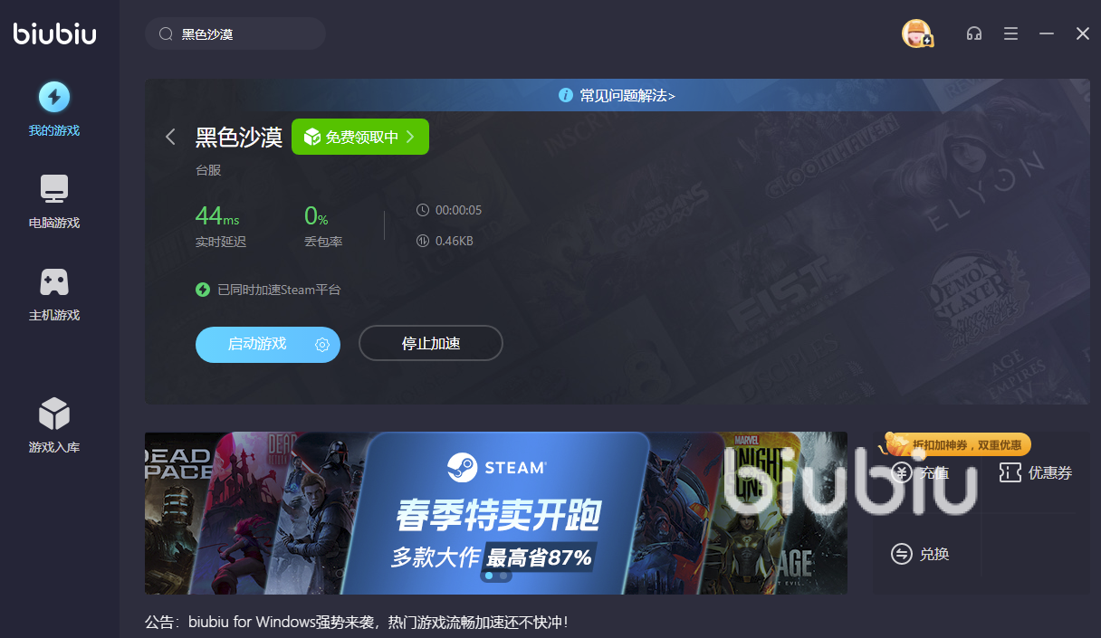 2023年04月07日 21:35 来源:三梭子大针蜂近来小编收到了很多玩家关于黑色沙漠这款游戏加速器的留言,那么到底steam黑色沙漠加速器哪个好呢?这款游戏目前的热度非常高,很多玩家都想尝试下,可是此款游戏暂时还没有推出国服的版本,这就让大家非常的懊恼,别着急,有了小编还有什么是做不到的呢,只要下载biubiu加速器,游戏的时候同时开启就可以尽情的体验了,感兴趣的伙伴跟着小编一起来了解下这款好用的加速器吧。