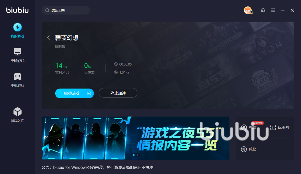 碧蓝幻想这类格斗游戏重点就在玩家的出招,在对战时一刻不能松懈,卡顿、延迟都会让出招失误,特别是碧蓝幻想中有冷却的设定,一个出错了以后,之后短时间内无法再次发动同样的套路,所以加速器是必备的,各位可以试试biubiu加速器。biubiu加速器会针对延时、丢包、抖动问题,架设网络专线实现多线路节点热备无感切换。除了能为海量国内外区服的游戏加速外,还提供很多下载渠道,在biubiu下载游戏会快很多哦,功能是不是十分丰富呢,足以满足用户们的各种需求!