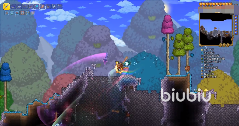而神圣之地这个地图会由普通的场地转变,在我们在移动的过程中,当背景出现彩虹,树木变成彩色,草地变成蓝绿色,河流的颜色为粉红色,这个时候神圣之地就会出现了,神圣还有其他的几种生成方式,比如我们可以通过击败肉山之后,地图就会随机生成为神圣之地。