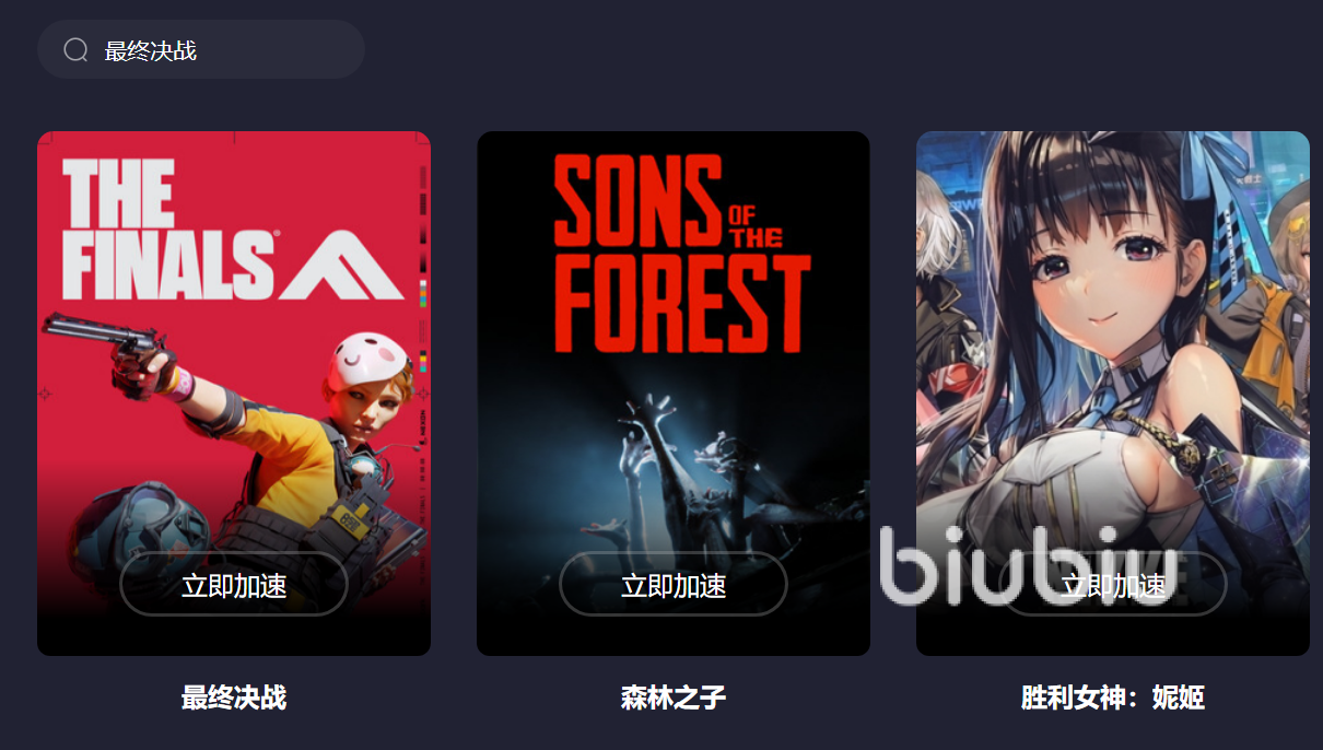 而无论是最终决战或是其他的游戏,我们都可以在搜索框当中进行搜索。biubiu加速器当中基本上囊括了市面上的大部分游戏。,无论是哪款游戏的玩家,都可以用biubiu加速器来体验最佳的加速效果。