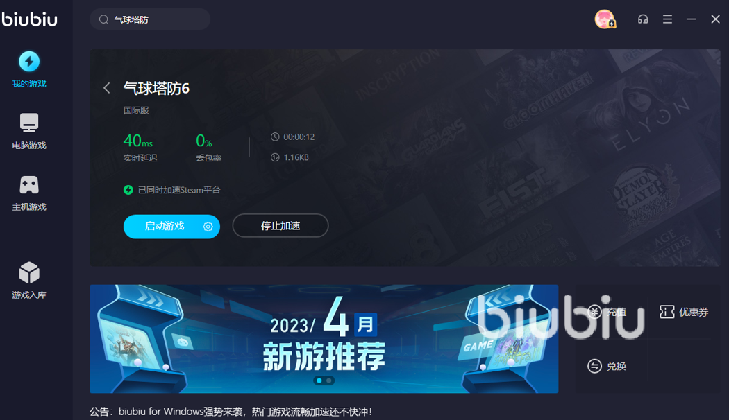 Biubiu是一款颇为专业的PC网游加速工具,针对目前市面上一些热门和有趣的作品开启了网络优化服务,深受大家的好评。这款软件有一个特点就是支持的作品特别说,气球塔防6虽然玩家数量也比较多,但还是偏小众的,很多加速平台都不支持,biubiu中就能够找到。而且使用biubiu还可以为Switch等主机的部分作品进行加速,避免大家重复购买不同的加速产品,真的是太良心了。