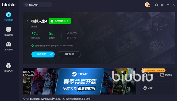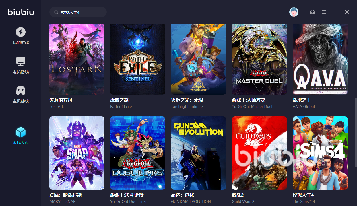 这款加速软件的使用方法十分简单,想要使用的话可以通过文中小编分享的链接来下载。运行打开时候映入眼帘的就是有大量的游戏作品可以加速,支持的作品真的非常多,基本上能够满足我们日常的游玩需求了。如果在游戏库中找不到这款作品,直接搜索模拟人生4就可以了。如果大家游玩的其他游戏在biubiu中找不到,也能够反馈给平台申请添加哦!