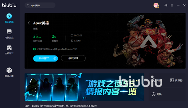 2023年04月12日 11:07 来源:狂战多末入蛾apex英雄这款大逃杀类的游戏可以说是目前十分热门的了,很多玩家都在尝试游玩。但是apex英雄卡顿怎么办大家知道吗?这款游戏本来对于玩家的电脑配置以及网络都有着比较高的要求,因为国服版本还没出,就算配置达到了也有可能会在游玩的时候因为延迟较大而感觉到明显的卡顿。游戏主要还是枪战的战斗方式,遇到网卡真的是让人十分头疼,今天小编就来教大家如何使用biubiu加速器来改善线上游玩体验,从而告别卡顿掉线。