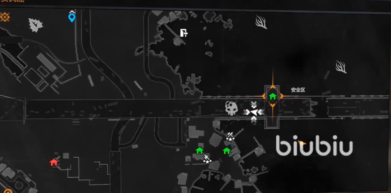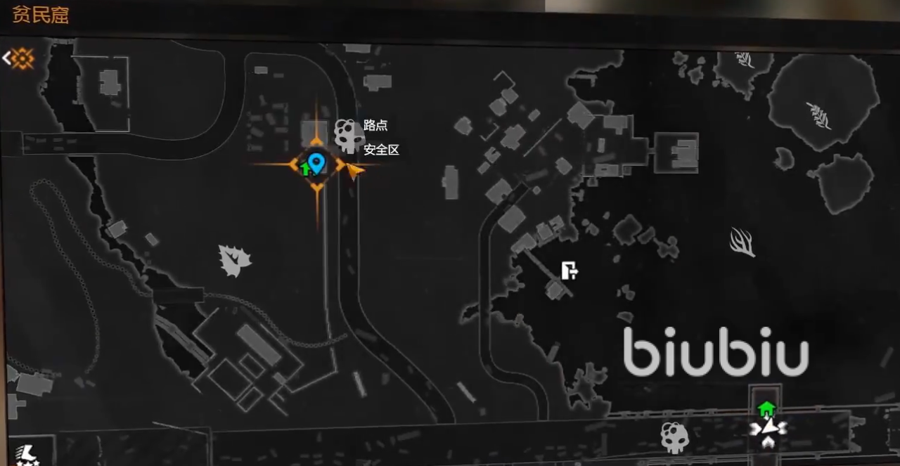 首先一个地方就是位于贫民窟这个地图的最右边的位置。我们打开地图移到最右边可以看到一座断裂的大桥,在左边是有这个一个逃亡者的捕食区,下边有两个安全区,右边也有个安全区的,我们需要去的位置就是在这个大桥的末端在这个位置有大量的丧尸。