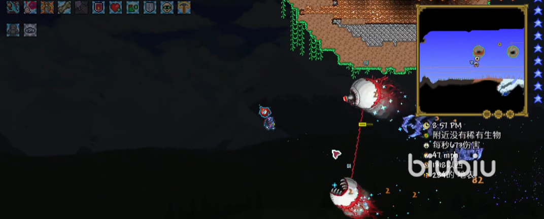 下面我们来看看双子魔眼,顾名思义就是两个眼球,两个眼球的血量是分开计算的。在P1阶段,眼球只会跟随玩家投掷火焰,我们只需要尽可能的拉扯,不要被它们碰到就可以了,Boss接近半血会进入P2状态,一只眼球会发射激光,另一只则会喷射有范围的火焰,这里我们需要注意的是,带有嘴巴也就是喷射火焰的那个眼球,或经常高速移动,想用近战的方式攻击玩家,稍有一个不注意就会暴毙。