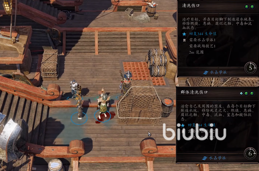 第一个要说的就是清洗伤口,水占学派,普通版距离非常小,基本上就是贴脸了,可以给两个队友脚下制造水坑,恢复少量血并且清除有害状态。而源力版就扩大了范围并且能够清除更多的有害状态,适合在黑矿区使用。不过要注意,如果队友有不死族,普通版甚至能对他造成伤害,而源力版顶多就是没效果。