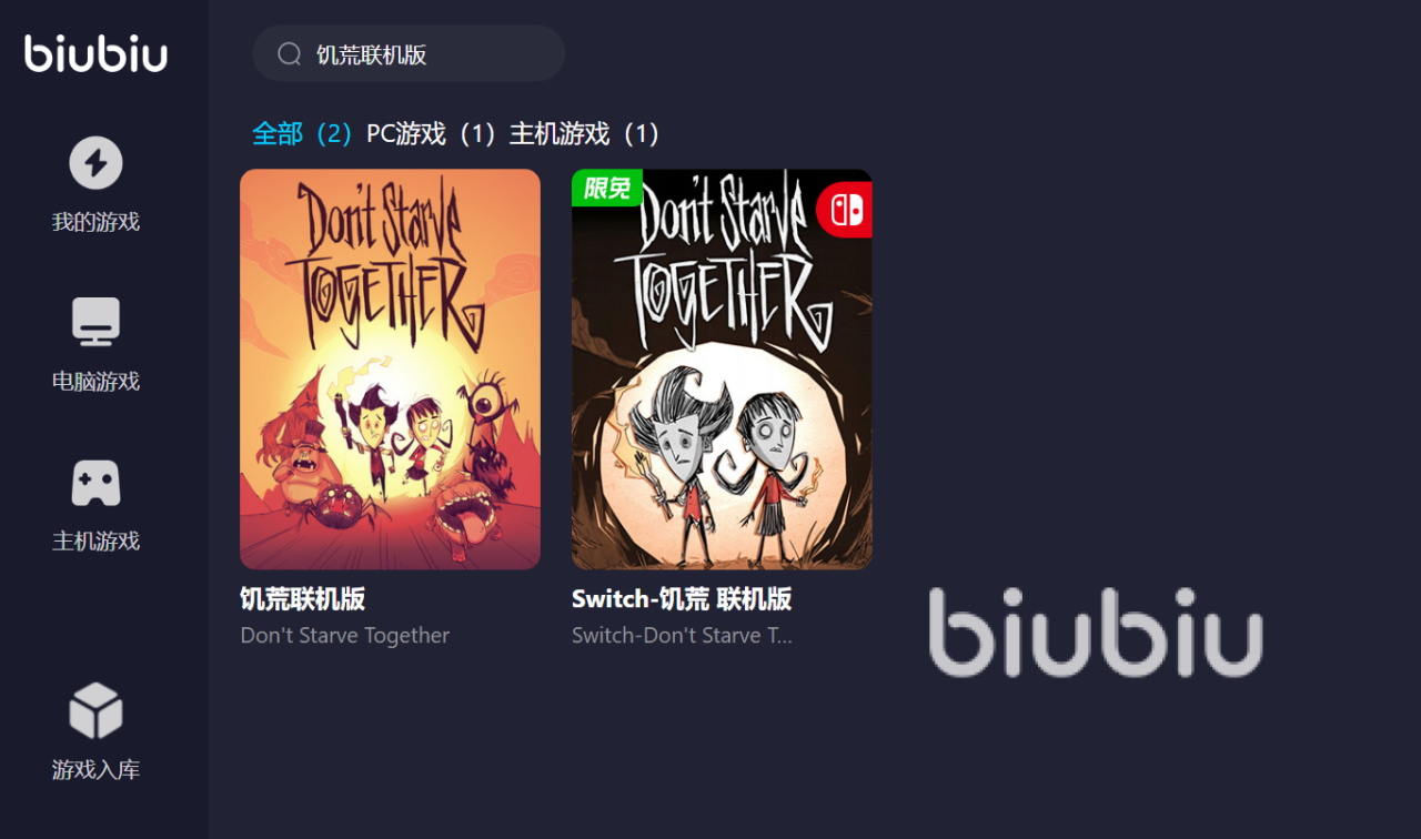 首先,在biubiu加速器上,我们直接进行搜索,有两个结果可供我们选择,大家也可以发现这个加速器支持的游戏设备有两款,我们都可以选择。