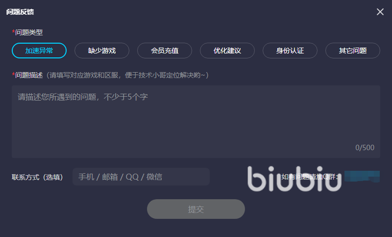 因为biubiu加速器现在还处于不断进步当中,也愿意去吸取用户分享的经验和建议,若是在使用中遇见了不愉快或是不懂的问题,均可在右上角的“客服”标志内进行反馈,里面一共包含了五种问题在内,若是有以上问题需要反馈的话即可直接输入内容,愿意的话还可留下自己的联系方式来后续进行跟进,致力于将每一个客户的意见都进行改进。