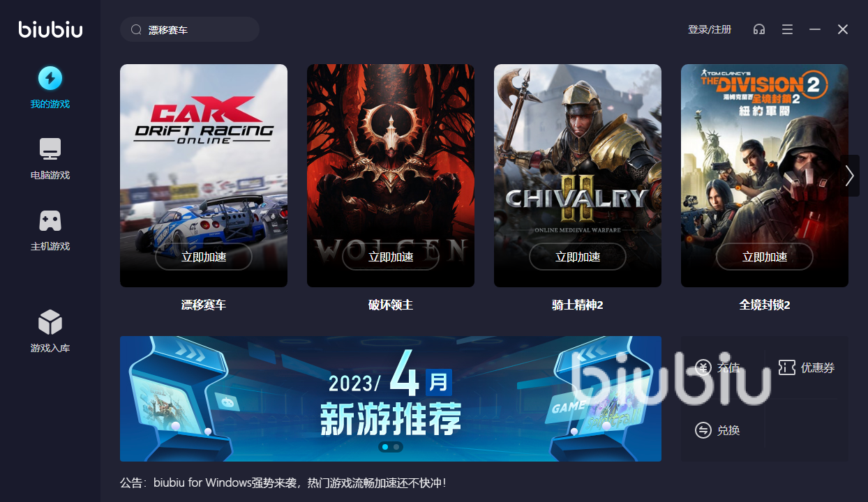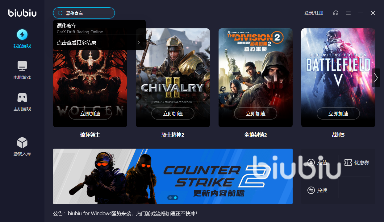 本文介绍了漂移赛车超级加速怎么开的相关内容,作为一站式加速平台,biubiu运行稳定,使用安全,电脑端工具一键开启加速,然后再启动游戏,无须通过其他方式登录游戏。当然,biubiu工具也支持手游和STEAM端游戏,提供了海量的福利,让用户率先体验biubiu工具的优点。