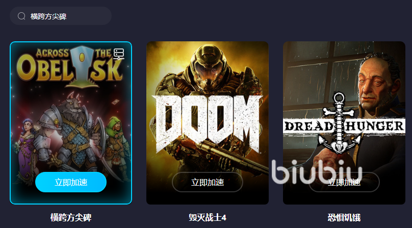 在下载的时候,建议大家可以去通过官网来搜索安装,如果想要省事方便,那么点击上文的链接也是行的,毕竟都是官网的正规渠道,安装成功以后,打开首页登陆进去搜索横跨方尖碑,玩家就会看到有对应的游戏,点击就可以为它进行加速了。