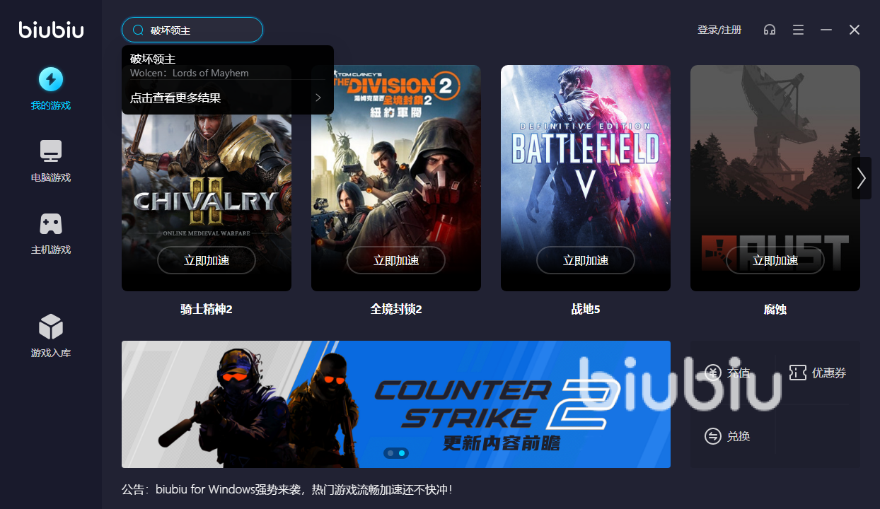第一步,针对端游,玩家们最好使用电脑版biubiu,这样才能良好适配破坏领主游戏。Biubiu电脑版下载链接在本文上方,大家使用最新安装包,才能支持全部游戏。这一工具不定时更新,才能支持海量游戏加速。