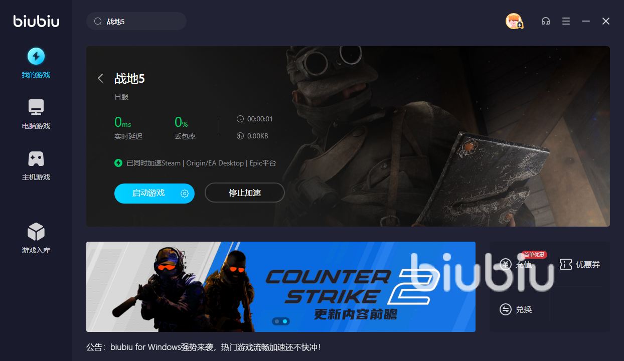 要知道游戏本身是能够去进行开麦交流的,也就是说小伙伴们如果网络不顺畅势必会影响到自己的表现,也让队友处于被动状态,而使用biubiu加速器就不需要有这方面的顾虑,大家可以去点击上文的链接,或者是通过官网去搜索下载,然后就是去注册登陆即可,在首页中搜索战地5,进入到专栏中来为它开启加速的服务,没有什么繁琐的操作,使用起来还是较为简便的。