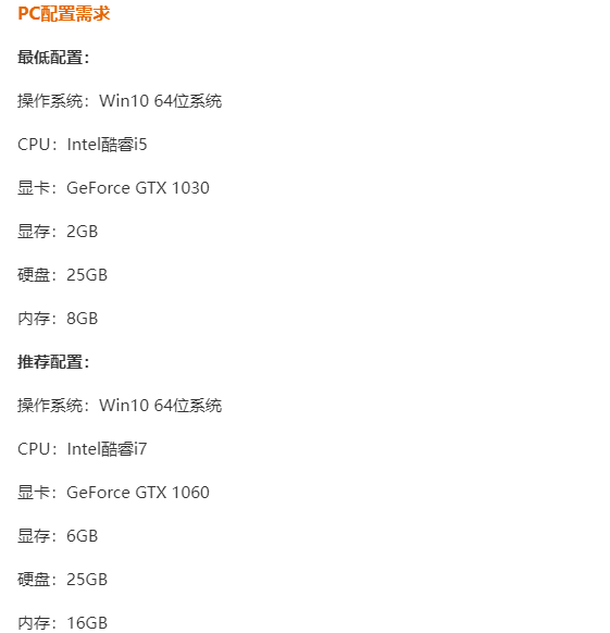 其实对于硬件方面也不是很苛刻,虽然有端游版本但是考虑到手游玩家体验,不可能将建模以及画面上做的像传统3A那么精细,这也是跨平台作品的一种妥协。无论怎样,Windows10系统是必须的,但其实11代也行,毕竟是向下兼容嘛。显卡方面是最低需要GTX1030,推荐位1060,其实都算型号毕竟老了,如果你经常玩游戏的话应该完全能达到要求。显存方面最低为2G推荐6G,在本世代来看也不算什么门槛了。硬盘的话需要25GB,但因为是网游运营模式需要长期更新,建议留个30G以上,而内存方面是8G或者16G,也是很常见了。