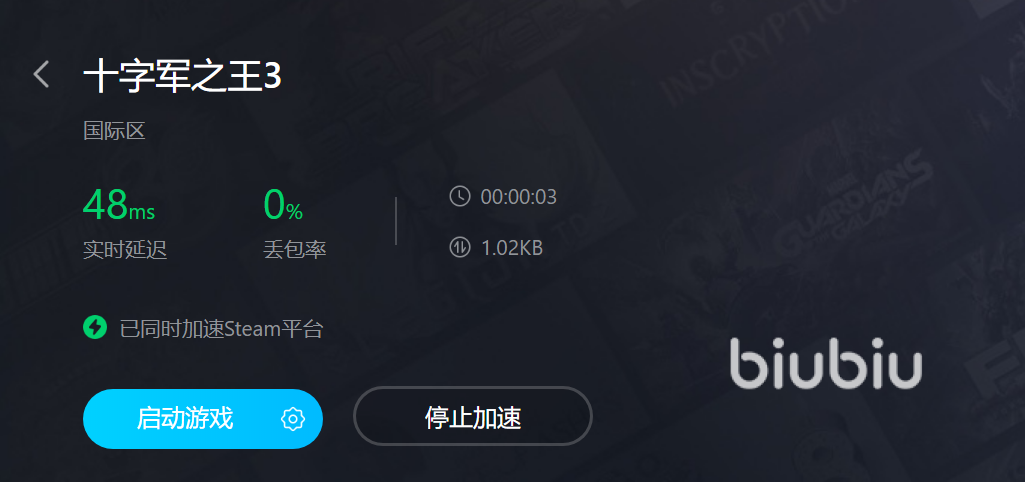 我们可以在biubiu加速器上找到十字军之王3这款经典的游戏,并且通过加速,我们也可以非常清晰的看到加速器对我们网络环境的优化效果,与我们原来的延迟相比,通过优化之后的延迟会明显降低,这样反映在游戏上,就是我们的闪退现象不再发生,而且游戏过程中也会更加流畅。