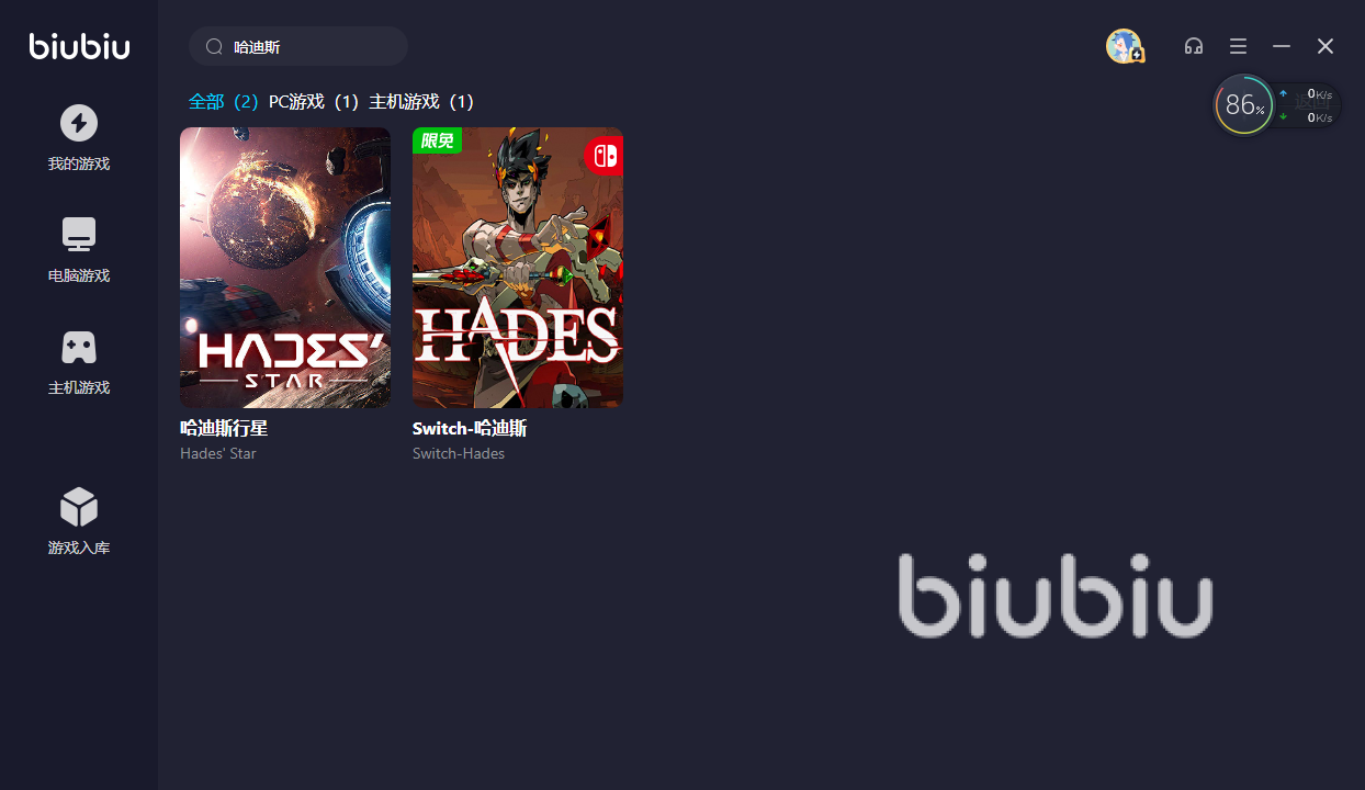 小伙伴们下载好biubiu完成安装了之后,只需要打开biubiu软件搜索哈迪斯游戏添加游戏即可,在之后小伙伴们想要启动哈迪斯游戏时只需在biubiu中找到这款游戏就可以了,十分的简单,也不需要哈迪斯游戏的玩家们下载或者操纵别的东西进行游戏。