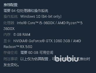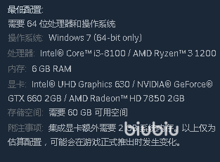 因为不是新作,所以支持Windows7以上的系统,如果你有更高的系统版本也会向下进行兼容。处理器方面最低要求八代i3或以上,6G运行内存,显卡方面比较出乎意料,居然出现了核显型号,但哪怕是开最低画面还是建议大家用独显,至少GTX660以上,以防止屏幕里NPC太多的时候掉帧。存储需要60GB以上的硬盘,最好是用固态以防止卡读条。
