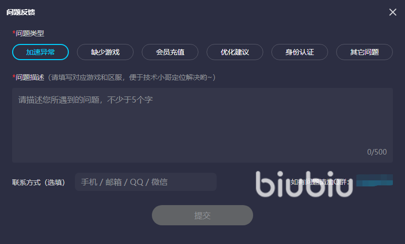 Biubiu加速器虽然上线也有很多年的时间了,可它依然保持着一种学徒的心态,每次版本更新都会认真去解决用户所反馈出的问题来,比如加速效果不显著或是找不到想要的游戏,这些出现的问题完全可通过右上角的客服小标志内反馈,反馈之后的问题都会被整理并进行研究和解决,用户也可选择留下自己的一个联络方式,针对用户反馈出的问题都会有专人后续进行跟进。