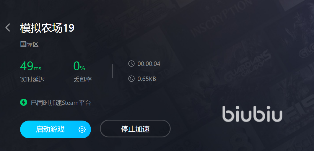 通过加速,我们可以了解到你络的动态变化过程,我了有延迟数据以外,上传速度,启用时间等等,也会展示出来。我们也可以在这个页面上直接启动模拟农场19这款游戏,在游戏结束之后,我们回到加速器上,点击停止加速。这样简单的流程,就是对这款游戏整个加速的操作流程。