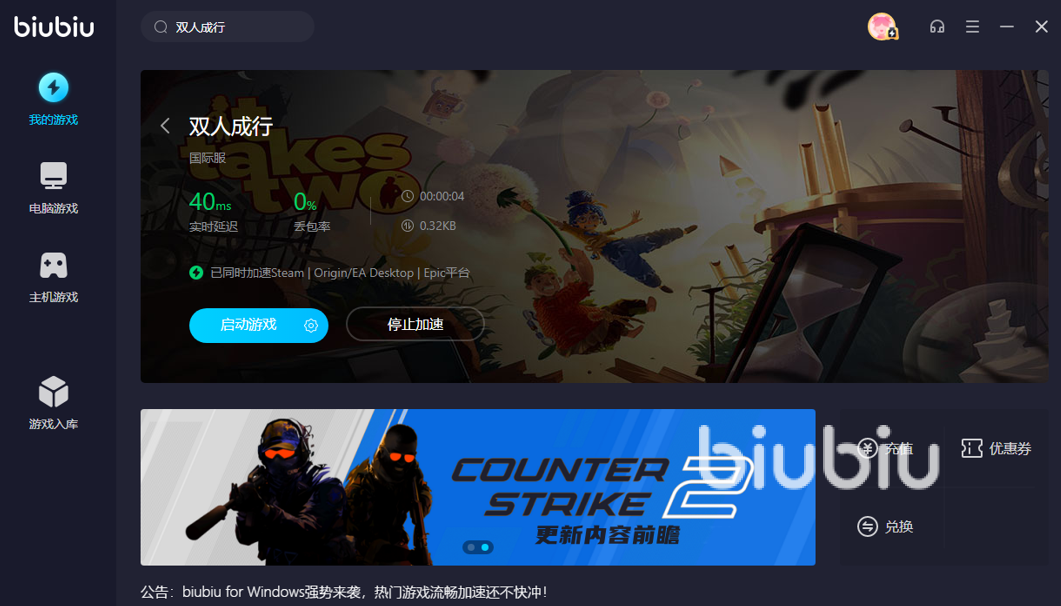 当然作为一款通关游戏总有一天会过关的。而biubiu加速器内含有海量的游戏都可以进行加速的。而且还会时不时推出限免活动,在限免活动期间部分游戏的加速都是免费的哦!各种热门游戏真的是应有尽有,肯定会有小伙伴们喜欢的类型,这些活动什么时候结束也是不一定的。Biubiu加速器使用内网传输,多线路节点设备,可以更快的连接海外网游。在下载方面全球专线支撑,全速下载无断点。不管是玩双人成行还是其他游戏,我们遇到过不去的关卡了,可以在biubiu社区里面找到很多的攻略,当我们遇到困难时给我们提供一个意外的思路。我们也可以给其他小伙伴们分享自己的游戏经验、玩法、策略和技巧。