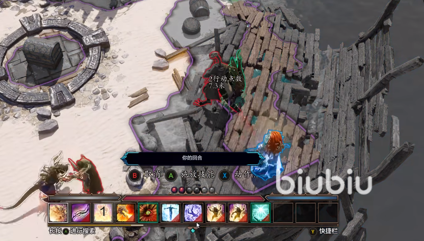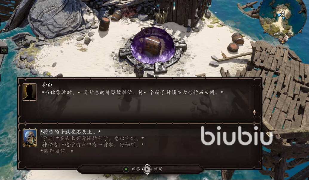 为什么对两者都重要,接下来揭晓谜题,至此游戏有两个不同的选择, 当玩家出来就可以去对面了,对着一个石环使用祝福技能,就会召唤出来船长,这时候可以跟他沟通,选择开战还是不开战。