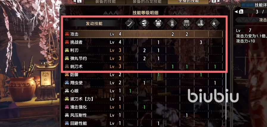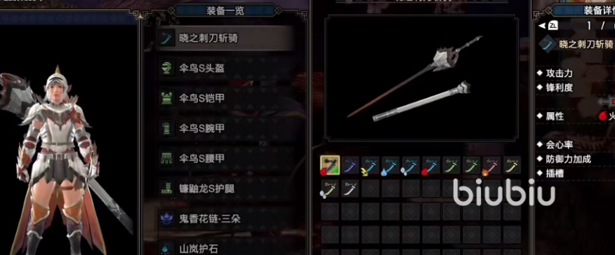 之后我们可以用这把蓝色武器,刷一下上位的“伞鸟”,给自己打一套伞鸟套装,我们的防御力也会有所增益,帮助我们更好的进行战斗。并且我们会激活一个技能“纳刀3”,在战斗方面有了明显的提升。