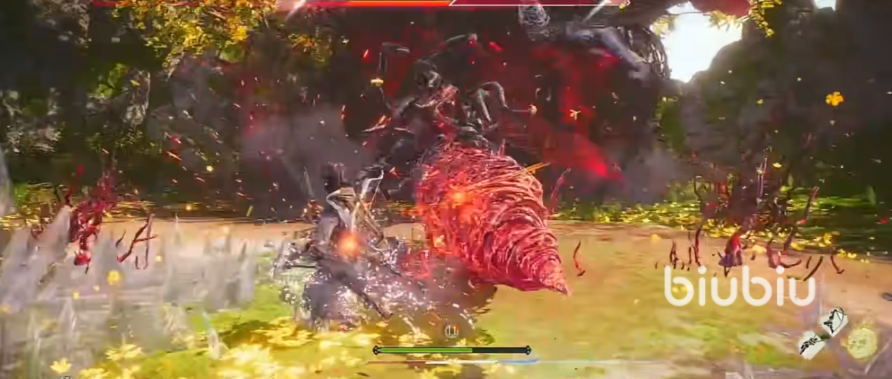 第一种红光必杀:使用右边的触角向前突刺,它会把触手举到最高点,然后进行蓄力,这里的难点就是会有一个延迟,可能会由于精神集中,过早使用弹反,我们只需要等到触手接触到我们再按就可以完美化解。在boss被弹反出硬直后,我们赶紧使用武将计将boss躯干条打满,进行处决,处决后boss还会有硬直,我们可以贪几刀,削减boss血量。在战斗中还有可能会遇到獓㧢使用牛角快速戳刺,如果大家对自己的反应比较自信,可以全部化解,如果不行,就防御着向前走到boss身下。