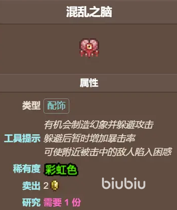 混乱之脑乃欧皇玩家的神器,有16%几率对到来的伤害进行闪避并制作幻想迷惑敌人,这个效果发动之后还会为自己上一个短暂增加暴击率的buff并且会是附近被击中的敌人进入困惑,说白了就是和眩晕差不多算是一个小控制效果。但如果你运气不够好的话,可能半天都无法触发任何特效,但独一无二的高娱乐性使其依旧值得作为毕业饰品使用。