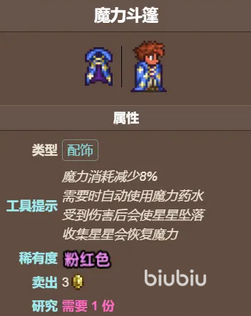 首先是魔力斗篷,自动帮你用法力药水补魔,此外也会减少蓝量消耗的8%,非常有用并且是懒人必备,有了这个你就没事可以多放几个技能了,也可以减轻一下高耗蓝武器带来的压力。如果你受到伤害的话会掉星星,拾取后也会回蓝,但是这个就相对有点鸡肋了毕竟没有哪个脆皮职业前去接敌人技能,所以也触发不了几次,但总体来说强度还是在线的。