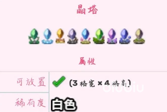 这个物品正式翻译叫“晶塔”要到1.4版本才有,如果你没找到首先看一下自己是否没有进行更新,用处也很明显就是进行快速移动。其实道理和《最终幻想14》中的以太水晶差不多,只不过这里不需要进行“共鸣”来激活。而是让玩家和各处的NPC提升好感度,然后来通过获得这一道具。