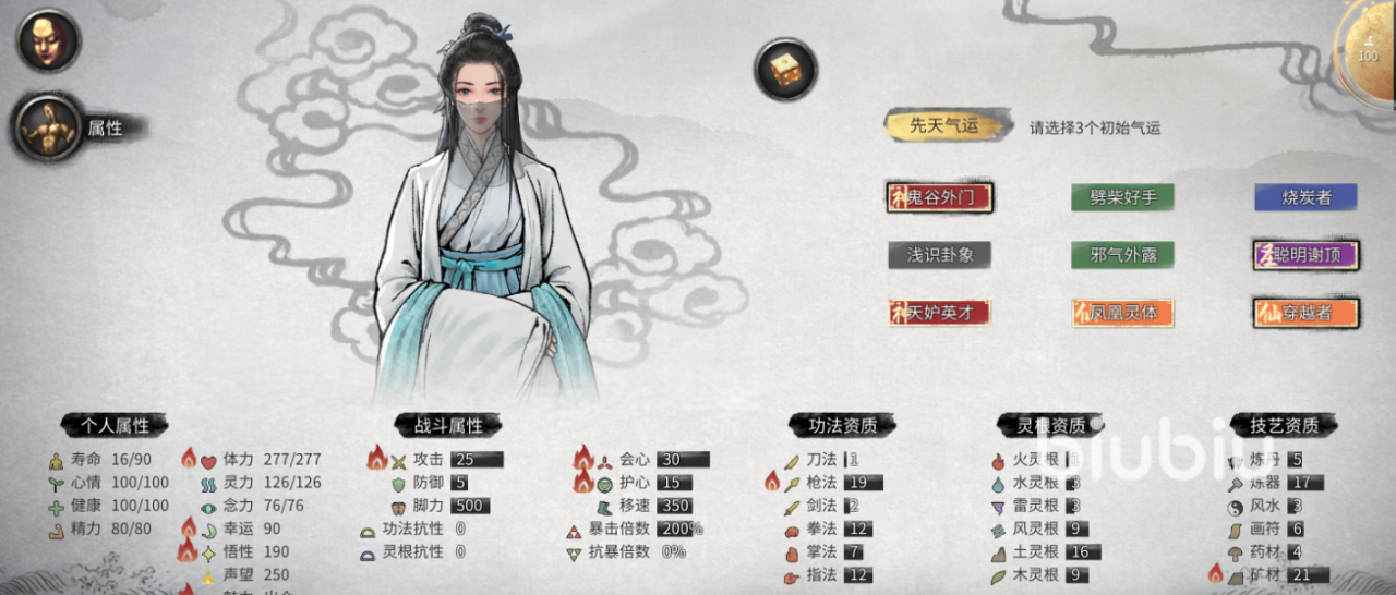 首先是外貌,各个外貌的魅力值是固定的,只要选最后一个,就能堆到最高魅力值,然后是先天气运,一开始只能选三个,而且是掷骰子随机刷,想要刷到好的气运是非常困难的,气运的品质从底到高颜色分别是白、绿、蓝、紫、红,这边说几个比较好的气运,倾国倾城、武圣传人、鬼谷外门、天命之子、天命之孙、武法灵童、鸿浩士族、游戏中悟性是比较重要的,因为后期很难升,建议一开始把悟性随机到95及以上,悟性的先天气运可以搭配鬼谷外门、人族圣体、武圣转世。