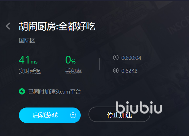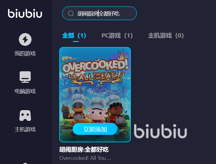 为了游戏过程一帆风顺,大家可以在游戏前开启biubiu加速器,游戏环境直接上升一个档次,之所以会这样是因为外服游戏导致的,游戏没有专门设置国内服务器,现在能玩的就是国际服,整体网络环境偏低,这才有了延迟、卡顿、闪退频发的现象。大家使用biubiu加速器使用“胡闹厨房”搜索,就可以查到所有带有这个ID的游戏了,选中对应的那款添加到“我的游戏”中,最后点击立即加速的选项就行。