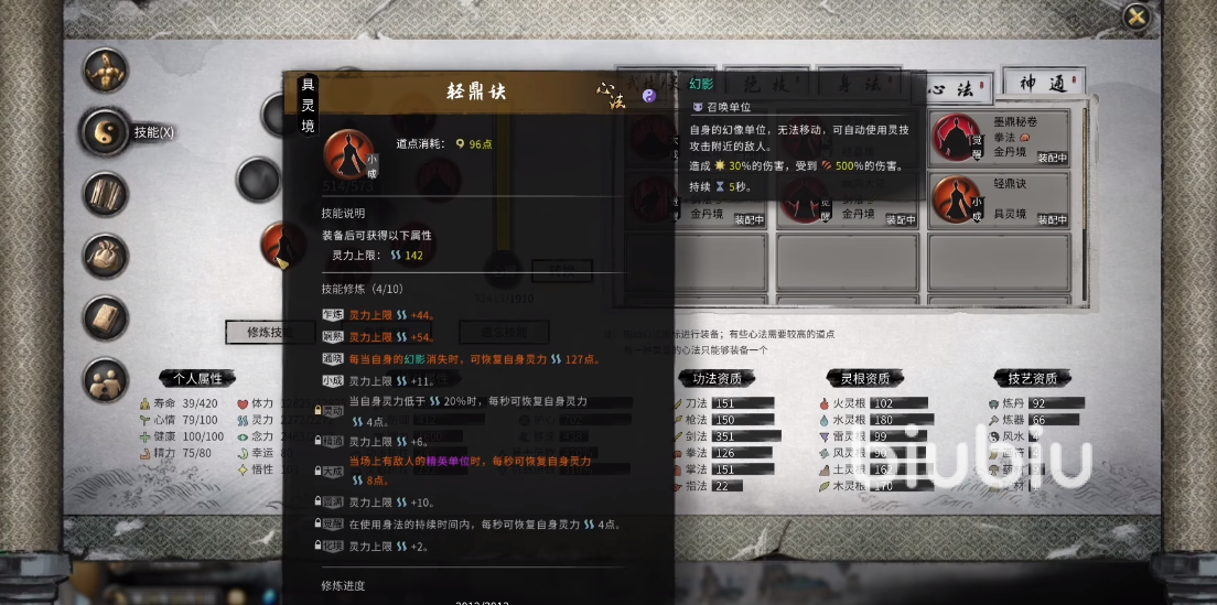 身法主要也是要走水属性,必须要强化幻影的效果,有显示增伤,增加持续时间,减少冷却CD的词条都可以要,当然安排一个给自身减伤的效果也非常重要。神通要做的就是附加给敌人有害状态,比如说攻击到敌方,使其移速降低,或者可以命中敌人后使用剑气追踪他。