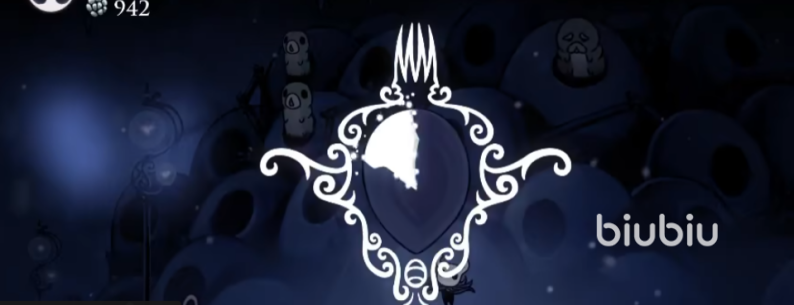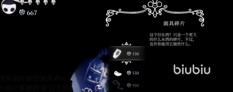 游戏中一共有13个面具碎片点。第一个在商店老板处可以购买到4个面积碎片,后两个碎片需要获得“店主的钥匙”后解锁,四个面具碎片合成一个完整面具。第二个点在幼虫爷爷那里,救回5个幼虫给一个面具碎片。第三个点在遗忘十字路,需要蛾翼披风和螳螂爪。