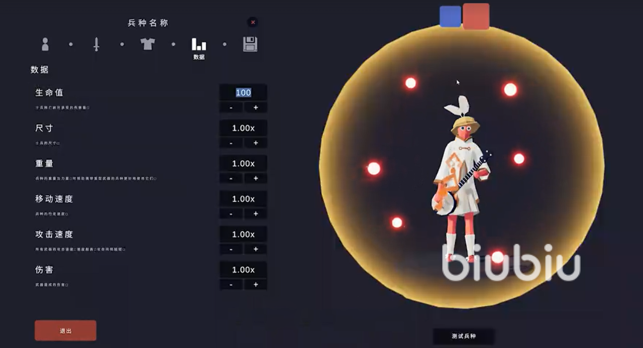 然后看下属性,血量加到700,不能太高也不能太低,毕竟没有护甲,攻击速度和伤害加到两倍和三倍。接下来再新建一个小人,给他加上黑农黑水,但设定成实际上发射出的是治疗光束,这也是为了给吟游诗人加上一个治疗技能,琴声可以让队友回血,把小人的身材调到最小,然后坐到吟游诗人身上,这样组合的吟游诗人绝对是游戏中最强的战术兵种。