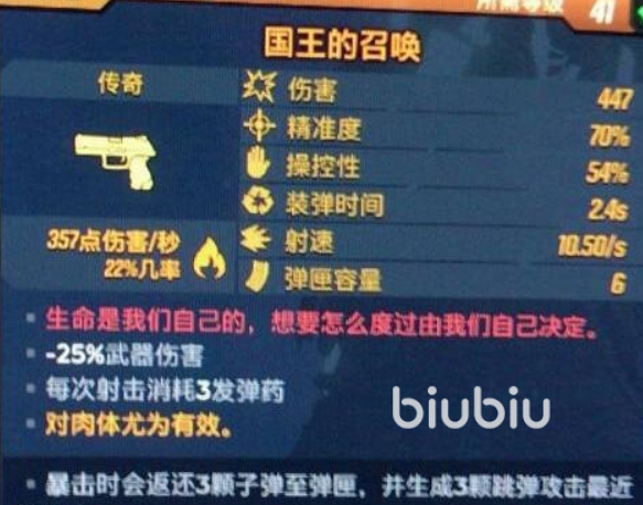 兽王的这个主动技能堪称BUG一般的存在,我们通过强化技能的选择,将主动技能的三发子弹自动解除技能效果,变成一个长期存在的效果。虽然说我们损失了一些伤害,但是我们在生存方面,得到了极大的保证。如果对伤害方面也有追求的话,我们可以在武器方面选择橙色的一把武器,叫做国王的召唤,当玩家攻击的伤害为暴击的时候,会返回三颗子弹到弹夹之中,并且同时可以再生成三颗会跳跃的子弹,攻击附近最近的敌人,这把枪的效果配上兽王的技能,可以说是一种无敌的存在。