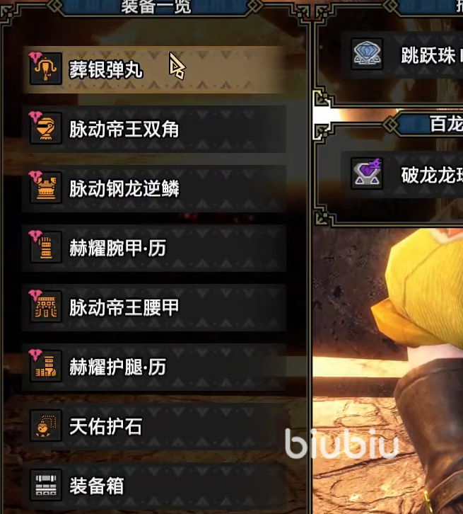 首先我们装备方面我们选择葬银弹药,护石选择跳跃珠加破龙龙珠、头盔选择脉动帝王双角,护石选择贯穿珠和痛击珠、胸甲我们选择脉动钢龙逆鳞护石方面我们选择速射珠、痛击珠加刚心珠,腕甲我们选择赫耀腕甲·历护石我们选择贯穿珠外加两颗早填珠。
