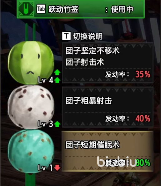 然后就是猫饭方面,猫饭我们选择使用跃动竹签吃四级的团子坚定不移术 ,三级的团子粗暴射击和一级的团子短期催眠术,这套猫饭的选择是比较偏向增加输出的,当然我们也可以选择使用四级团子粗暴射击,三级的团子坚定不移术和一级的短期催眠术而这套猫饭则是更加侧重保命效果同时也可以给我们带来一些伤害的增加。