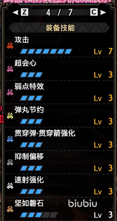 在技能的选择上以核心技能贯通弹、速射为主、同时我们需要将减轻后坐力和快速装填也需要学习建议将等级学满,然后可以给我们提高输出的技能我们可以学习攻击、看破、超会心外加弱点这些技能我们点到两级就可以了,辅助技能我们选择回避距离提升和弹丸节约这两个技能我们同样学习到两级就可以了,然后就是连击、狂龙症、因祸得福、业凯这四个技能我们只需要学习到一级。