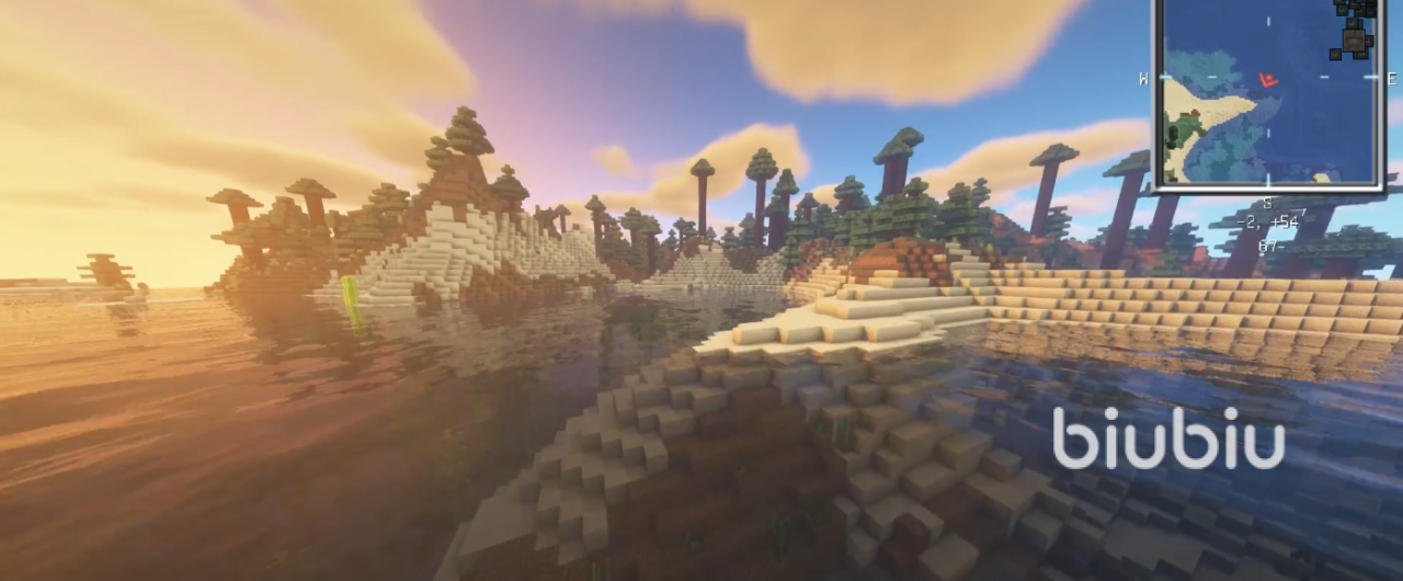 首先是一号种子:9046887226457475873,输入这串种子命令后,你会出生在恶地旁,站在红沙上方,咱们向着湖水的方向游去,很快就可以看到水下发亮的方块,这下方就是海底神殿了。