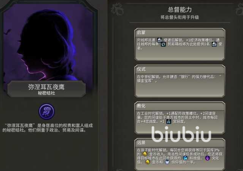当玩家向没有本国使者的城池派遣使者的时候,我们有机会发现这个结社,它在一级时可以给玩家提供一个额外的经济政策槽位,可以提升各个城镇的使者加成效果。当我们达到二级之后,我们可以解锁一个镀金宝库,这个宝库可以代替掉我们游戏中的银行建筑,它可以使我们在商业中获取到相邻加成的文化值。并且如果我们的城池中有港口的话,那我们则会再次获取一个商路。
