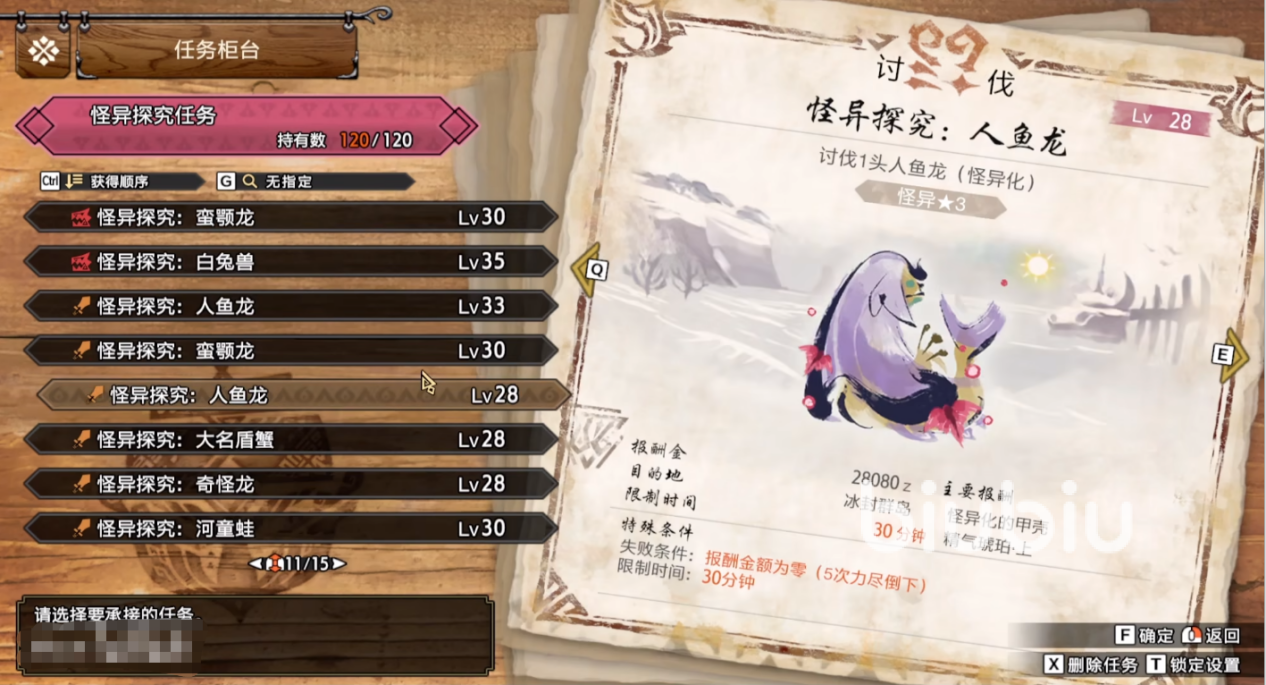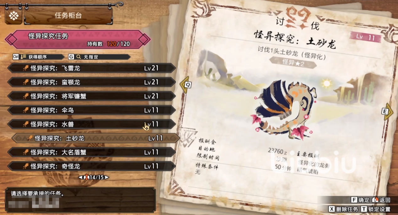虽然这个委托是随机的,但是也不是自动出现在玩家的列表中,而是要找到巴哈里先进行交谈,然后才能开启这个功能,领取一些等级比较低的委托去完成。把当前可以触发的挑战都做完之后,就会随机触发一些高等级的委托,不过可能目标还是一样的。这就意味着怪是重复打的,但是一些具体要求是改变的,要求的区域,打怪限制时间,还是参战人数和死亡次数都是会随机公布的。