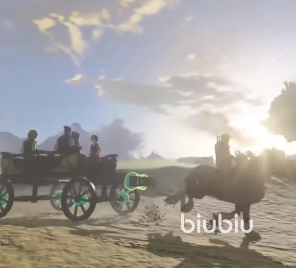 当然之所以我们会去制作马车,也是因为之前官方曾流出了一段王国之泪的预告片,我们可以看到林克骑着自己的小马驹,拉着一车的npc在快速前进。这里可以看到马车链接的地方全部都有绿色物质包裹着,就是通过林克的究极手,才能让马车固定的。