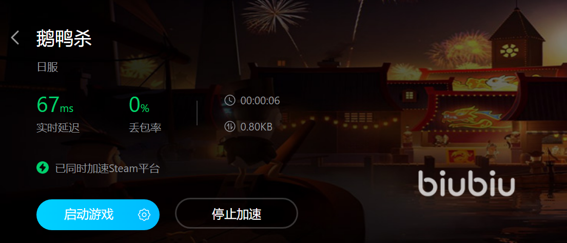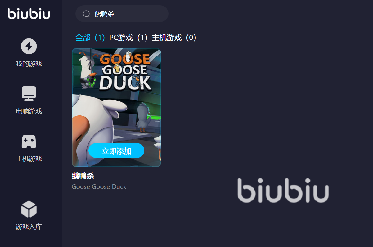 biubiu加速器依靠专业硬件加速技术和智能算法,可以有效地优化网络连接,降低延迟。在biubiu上直接搜索“鹅鸭杀”就能准确的找到这个游戏。除了鹅鸭杀游戏之外,这款加速软件能支持市面上大部分热门游戏的加速功能。除了电脑端的游戏之外,主机端也同样支持。