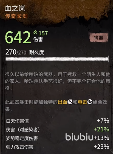 在这里有些还是下限不低也比较好用的存在,首先是血之岚,面板比较高不说而且还发光,太刀的外观本身也比较炫酷,你再怎么“脸黑”拿到手也能达到600以上。对于感染者会有伤害加成,但这个数值就得看你们自己运气了,一般会在20%左右,但打人类的话是没有任何增伤的,暴击会附带出血和点击的特效。另外好像它不会出回血的效果,至少目前没见过,玩家可以在哈珀商店进行兑换,成本比较高但这么高的攻击力也不算亏了,能一直用到毕业。