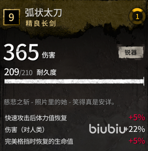 弧状太刀在完美格挡以及攻击时都会有体力恢复,只不过有的玩家拿到的是强击回血,另外的则是轻击这都比较随机看脸,但作为续航来说无疑是一把神器,打着打着血就满了,不过只对人类有伤害加成这一点挺鸡肋的,也没有任何打击特效,但作为锐器攻击频率比较高可以弥补很多缺点。