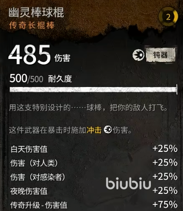 幽灵棒球棍也算比较好的一把武器,虽然面板没前者高但是判定范围比较大,使用手感非常不错,暴击会施加冲击效果直接将敌人击飞十分有趣,另外他对于感染者和人类以及白天夜晚都有伤害提升,可以说是全游最万金油的一把武器之一,你还可以对它的面板进行升级,如果你已经拿到了可以用用看。